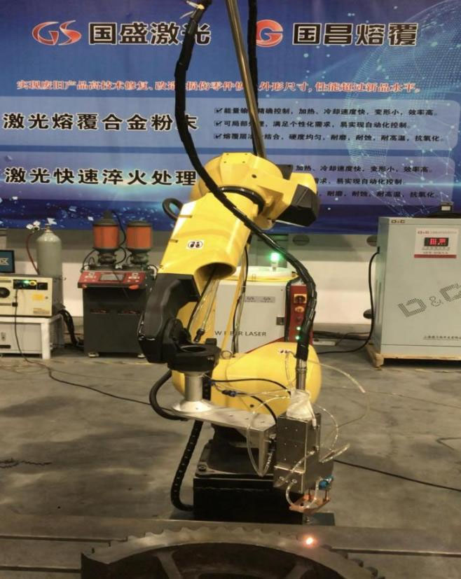 多功能熔覆/淬火设备主体采用六轴机器人设计,配置变位机、旋转主轴箱、尾座、托架及人机界面控制系统,各部件可以实现联动;配置具有加热功能的双伺服电机控制的双筒高精度送粉器,可实现精准送粉的同时对粉末预热烘干;全水冷熔覆/淬火头可实现24小时连续作业;该设备最大回转直径Ø1400mm,装夹工件最大长度10000mm,最大承载能力10T;可实现轴类、盘类零件的外圆及复杂曲面熔覆/淬火,也可对内孔进行熔覆/淬火。该类设备可根据客户需求提供个性化设计。